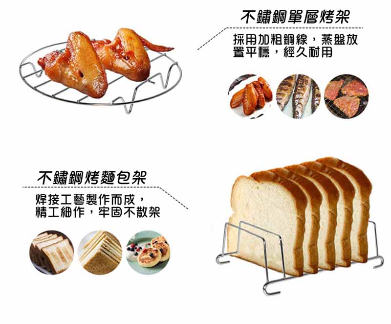 包裝內容物:七格蛋糕模具x1、手提鍋x1、披薩盤x1、分隔板x1、不鏽鋼雙層烤架x1、不鏽鋼單層烤架x1、不鏽鋼烤麵包架x1、夾子x1、提盤器x1、隔熱墊x1、矽膠刷x1、烘培油紙x100